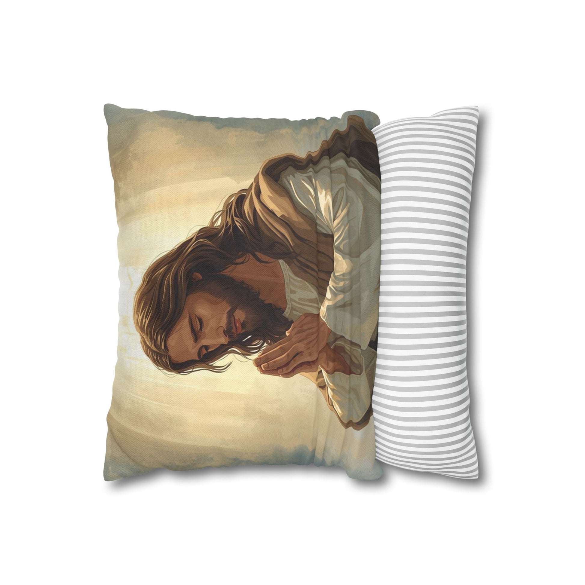A soft, devotional pillow cover that brings a quiet moment of prayer into any room. The double-sided print shows a gentle, reverent image of Jesus with warm, halo-like light—an image that invites reflection and calm. Lightweight spun polyester keeps the colors vivid and the fabric smooth, while a concealed beige zipper blends into the edge for a seamless look. Tuck this cover over your favorite insert on a living room sofa, church lounge chair, or bedside nook to create a space that feels thoughtful and peaceful.