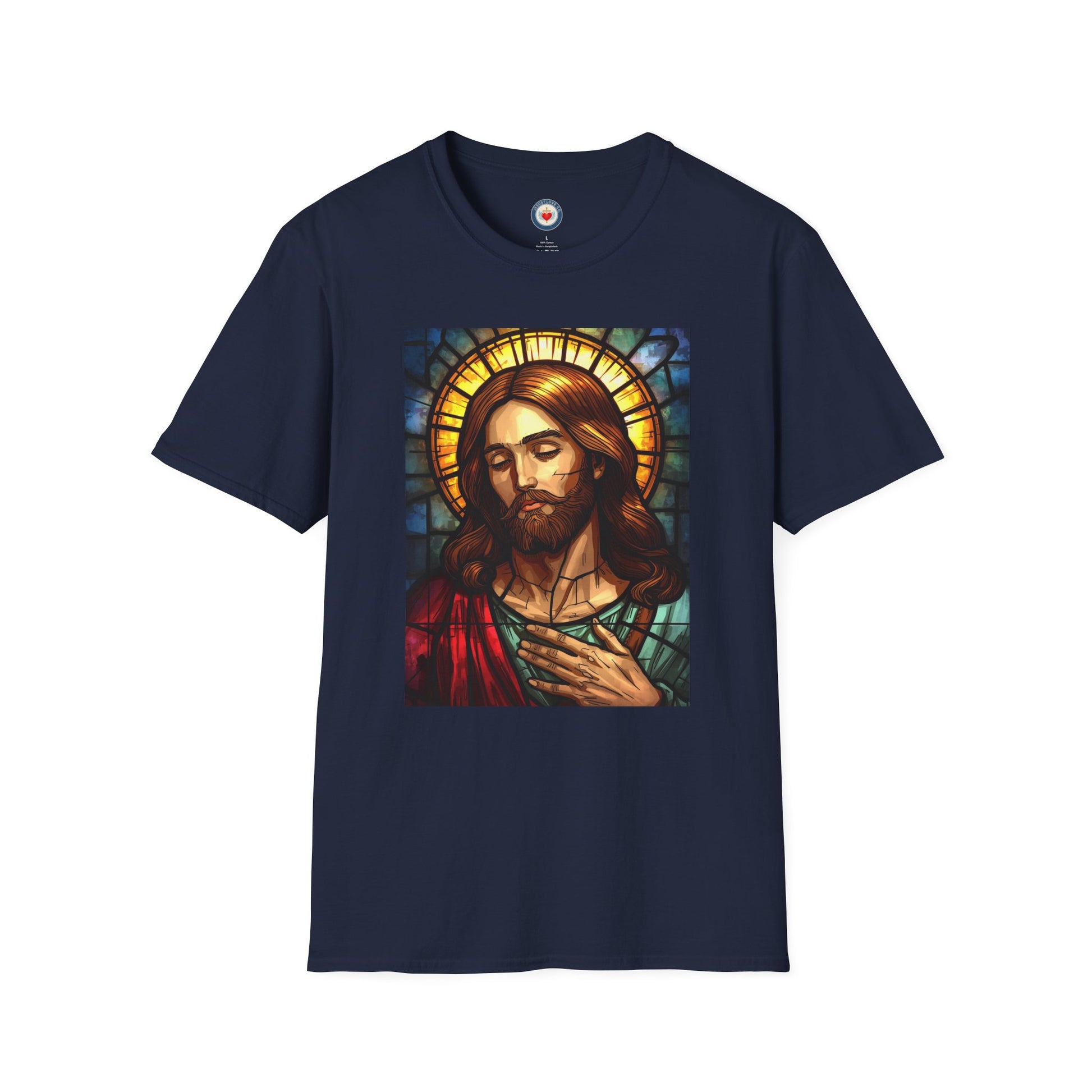 This lightweight cotton tee carries a quiet, reverent mood—like sunlight through stained glass. The image of Christ rendered in warm, jewel-tone hues sits centered on a soft white canvas, bringing a chapel-like stillness to everyday wear. The shirt drapes easily, letting the artwork be the focal point whether you’re headed to Sunday service, a community gathering, or a reflective afternoon at home. It feels familiar on the skin and respectful in presentation, made to be worn by someone who values subtle faith expression and thoughtful craftsmanship.