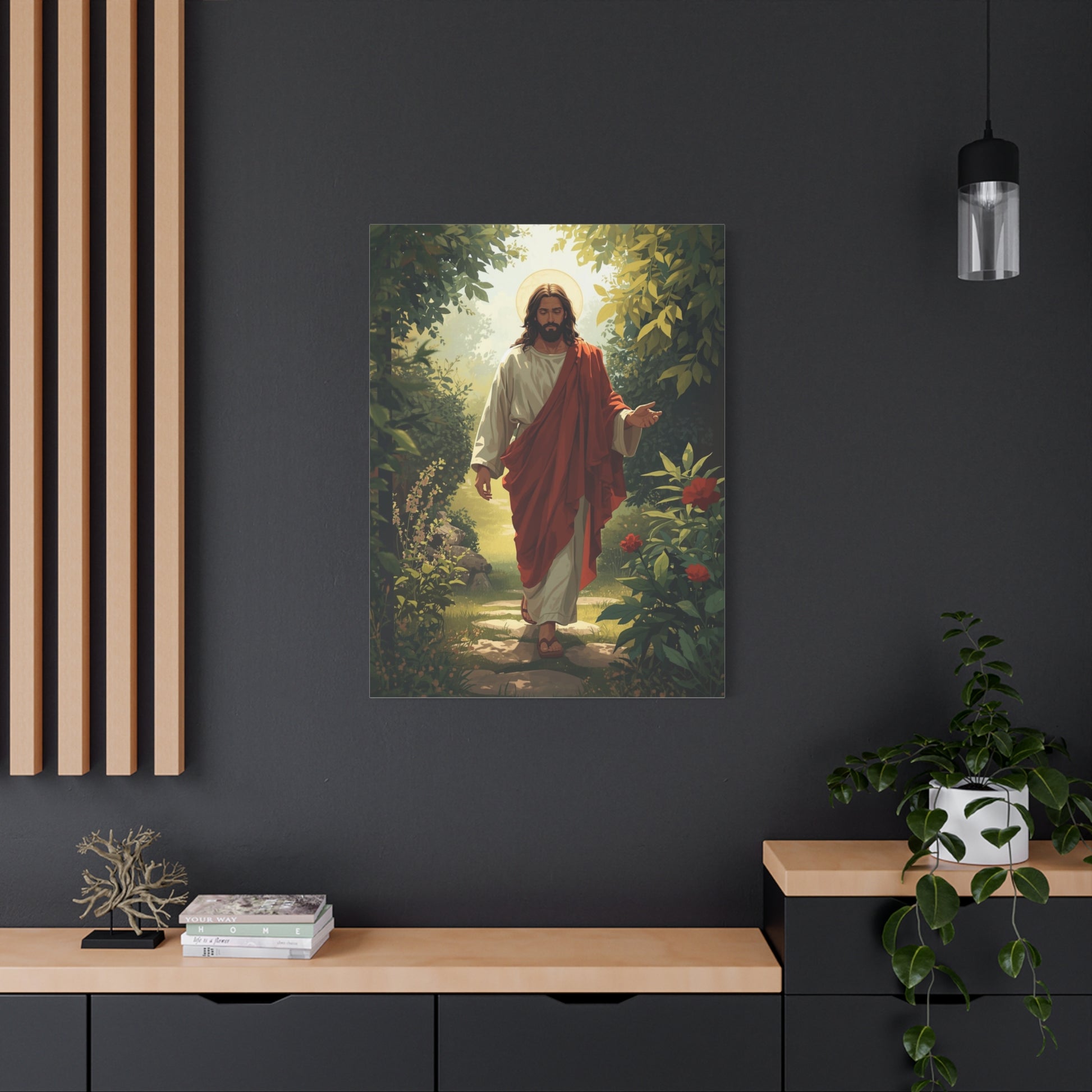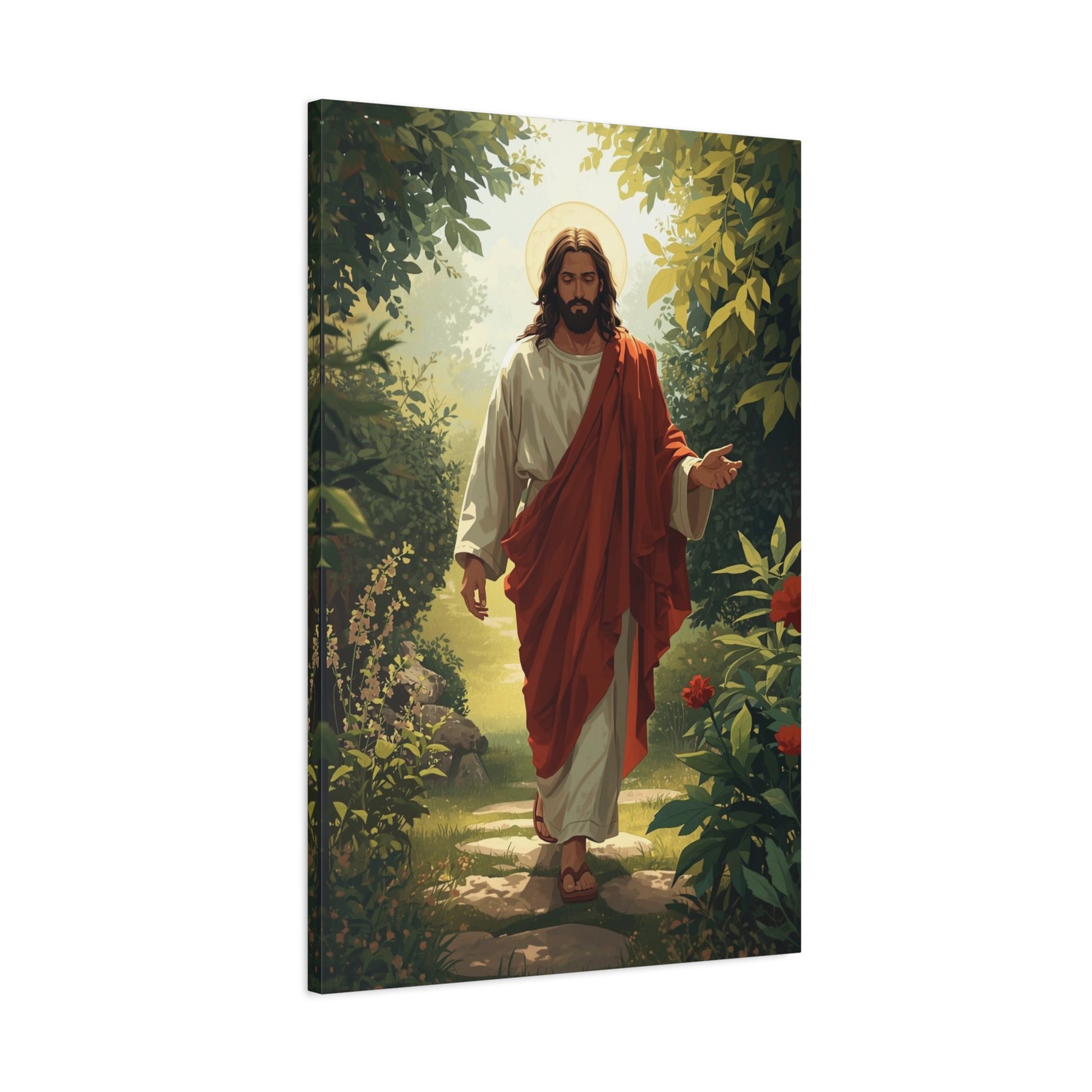 A tranquil, reverent canvas that brings a quiet moment of faith into any room. The matte stretched canvas captures soft, painterly light and rich, natural tones—deep greens, warm creams, and a touch of crimson—so the image feels like a window into a garden of peace. It hangs flush against the wall and reads like a small sanctuary: calm, grounding, and gently luminous. This piece fits into everyday life as a place to pause—by a reading chair, over a mantel, or near a bedside—inviting reflection and a breath of calm during mornings, evening prayers, or slower Sundays.